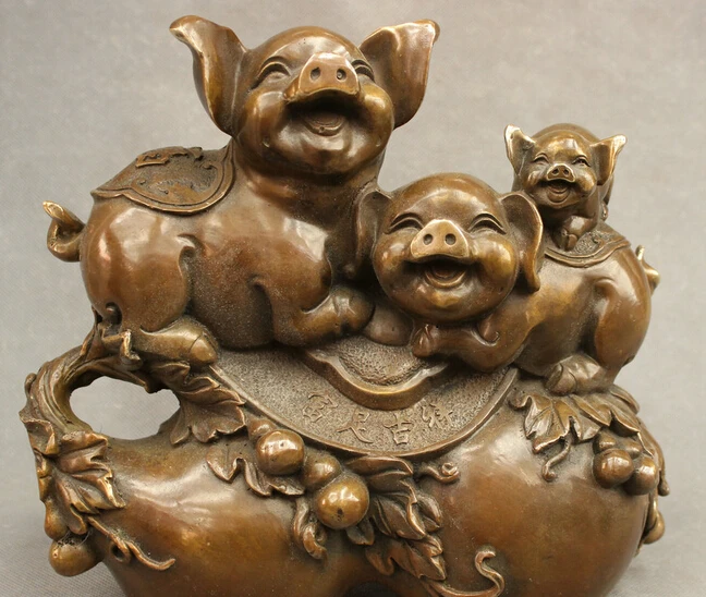 wholesale factory 10" Chinese Bronze Copper Family 3 Happy Fu Pig Statue On JiXiang FengShui Gourd